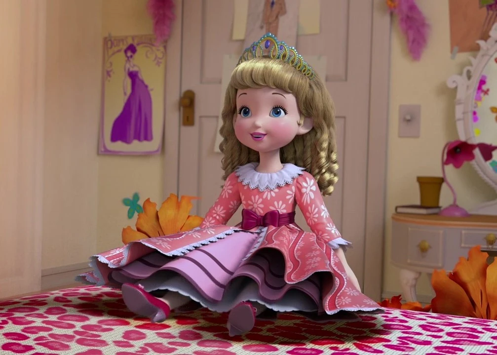 Marabelle is a fair-skinned blonde doll, blue eyes, and thin eyebrows. She usually wears a pink princess dress - which has white flowers and sleeves, with two layers underneath, a purple and a white, a red bow tied at her waist, a princess tiara, and a fuchsia pair of low heels shoes.